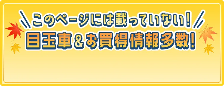 ■車両本体価格は、応急パンク修理キットつきの価格です。■販売店でセットする付属品は別途です。車両本体価格には特別装備品以外のディーラーオプションの価格は含まれておりません。■メーカーオプションは組み合わせによっては同時装着できない場合がございます。また他のメーカーオプションとセット装着になる場合がございます。■写真は実際の色と多少異なる場合があります。■掲載内容に明らかな不備があった場合、やむなく販売をお断りすることがあります。あらかじめご了承ください。■詳しくは営業スタッフまでお問い合わせください。