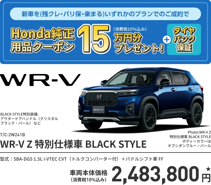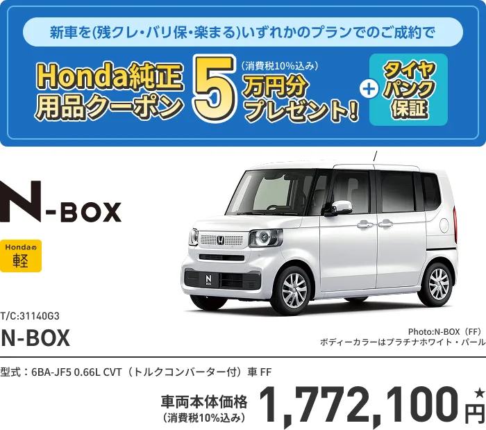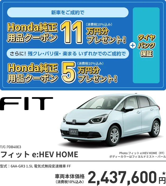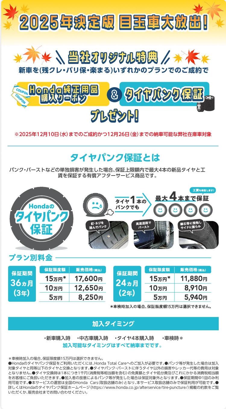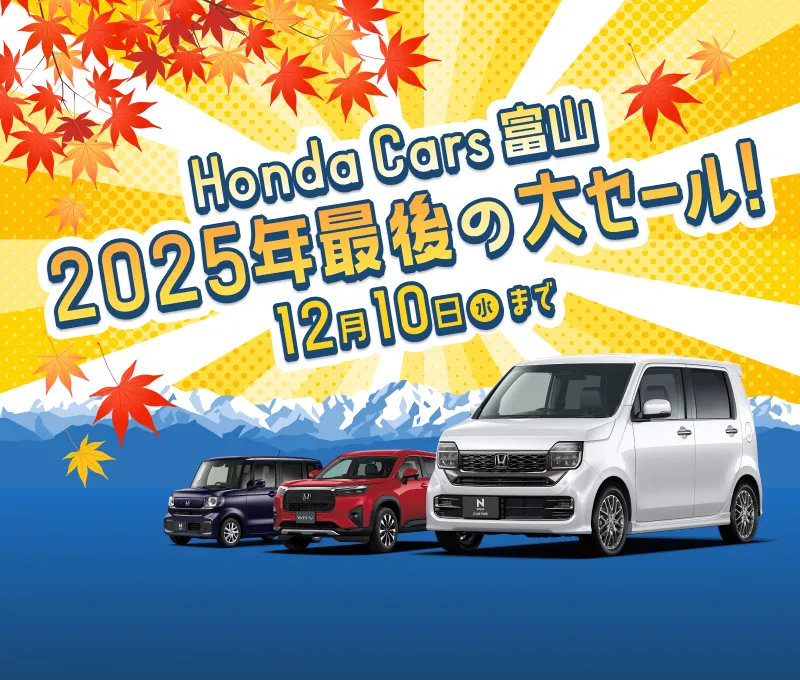 【Honda純正用品クーポンプレゼントについて】●Honda Cars 富山にて、期間中に新車をご成約かつ登録(届出)いただいた方が対象となります。(Honda Cars店でのみ) ●クーポンはご成約いただいた販売店でのみ有効です。 ●クーポンご利用の用品はご成約いただいた車両に取り付けさせていただきます。 ●クーポンは対象車種のホンダアクセス公式ホームページに掲載されているHonda純正用品(Hondaカーケアメニュー、ケミカル用品の一部を除く)にご利用いただけます。 ●プレゼント分を超える代金についてはご成約者様のご負担とさせていただきます。また、総額がプレゼント金額に満たない場合の差額の返金・値引きはありません。 ●本キャンペーンの権利の他人への譲渡や換金、値引きはできません。 ●他のキャンペーンと併用できない場合があります。 ●取付工賃、取付アタッチメント費が別途必要になります。 ●タイプ、カラーによっては登録(届出)までに時間を要するため対象とならない場合がございます。 ●詳しくは営業スタッフまでお問い合わせください。