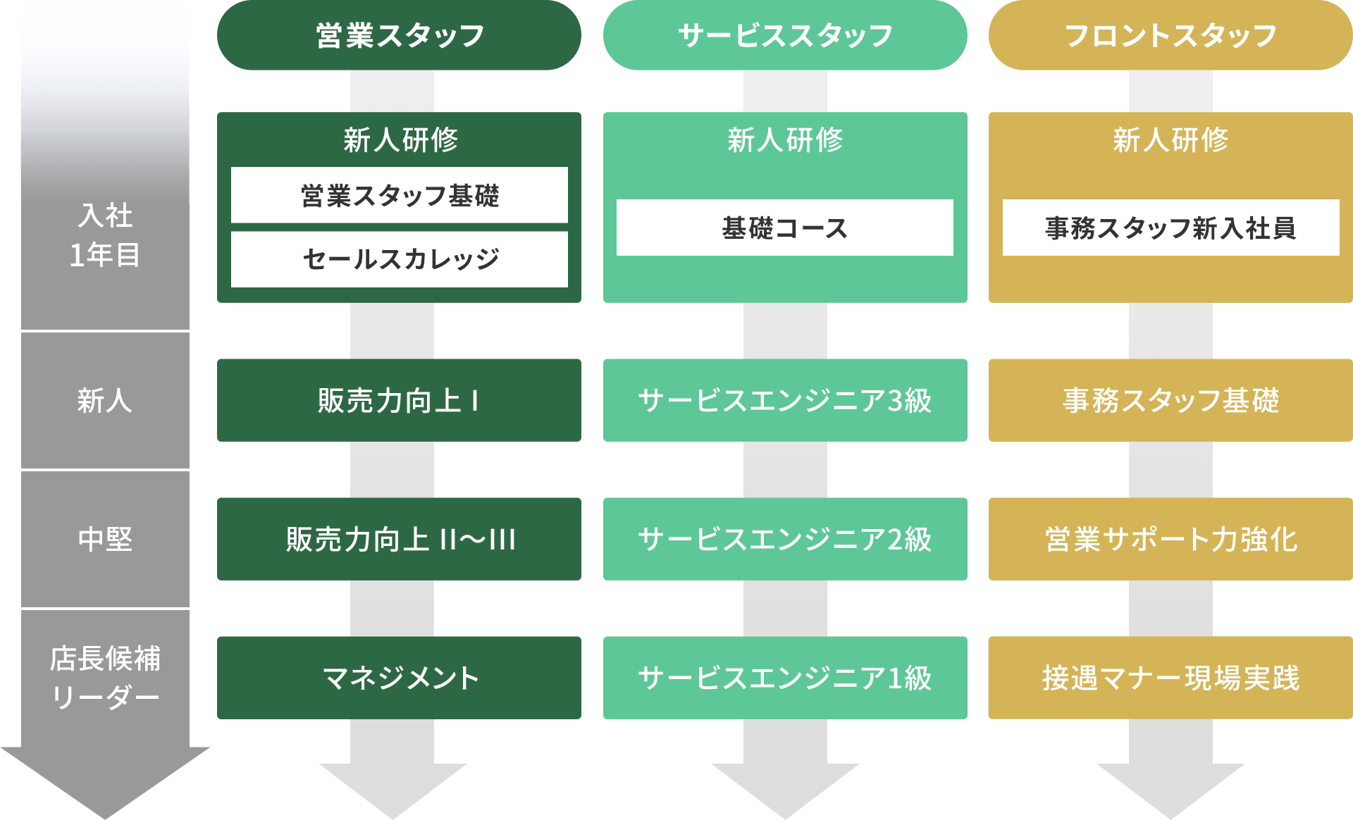 『社内での教育・研修』と『Honda主催の研修』の2本立て体制で成長を応援します。